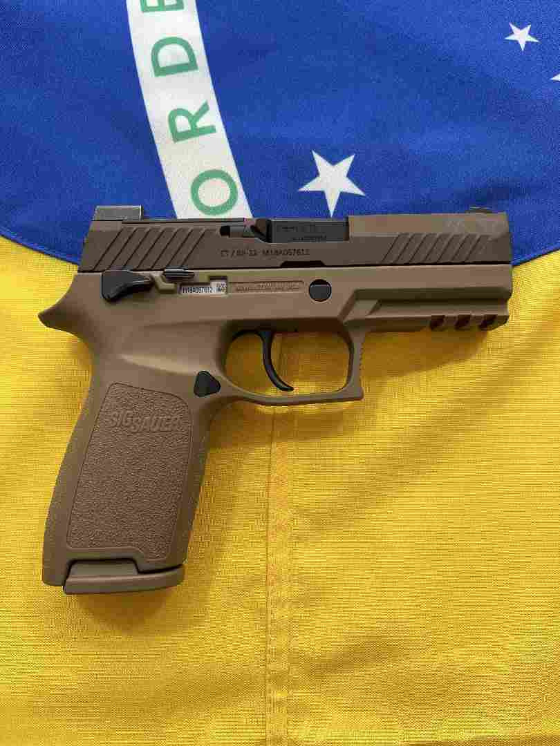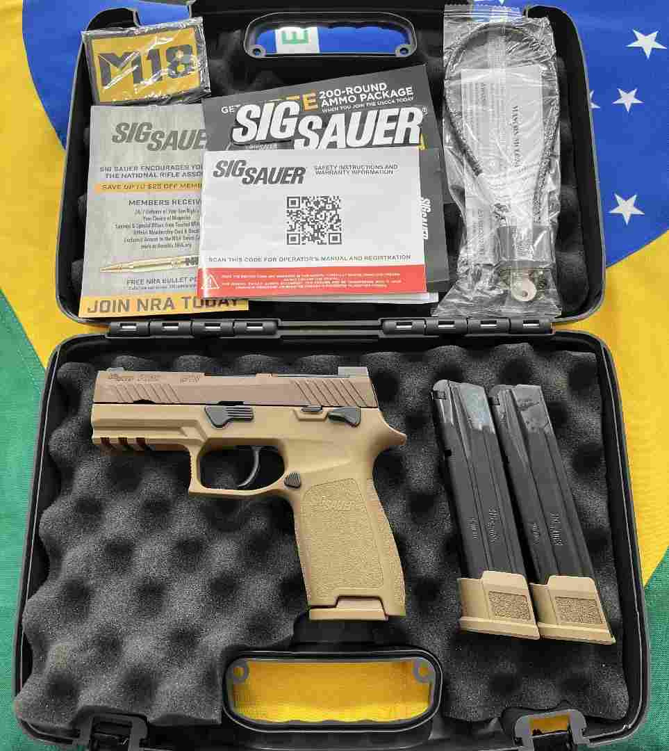 Marca: Sig Sauer / Modelo: P320-M18 / Calibre: 9x19mm / Capacidade: 17+1 / Cano: 99mm / N° de raias : 6 - Direita / Funcionamento: Semi auto / Acabamento: Coyote / País de Fabricação: Estados Unidos